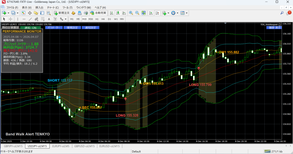 これは、従来の「広がったらトレンド」という認識とは根本的に異なる。天響は、結果ではなく“発生そのもの”をトリガーにしている。この一点だけでも、常識的なボリンジャー系ロジックとは完全に別系統に位置する。